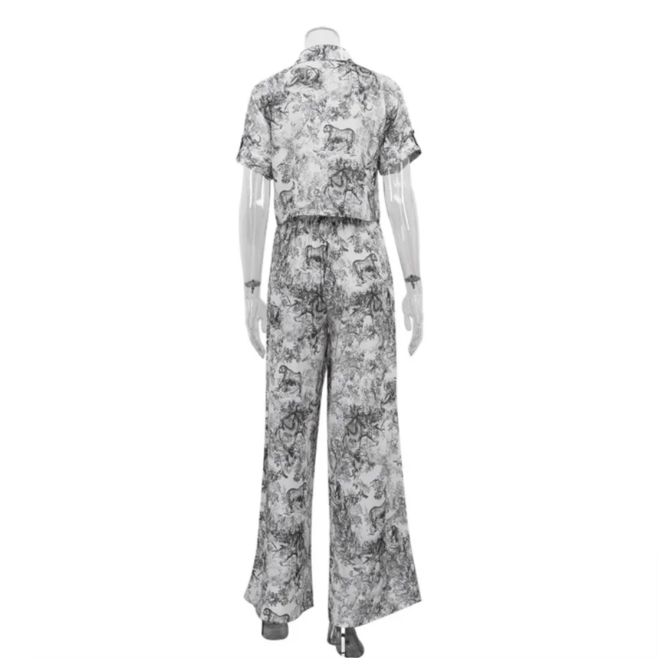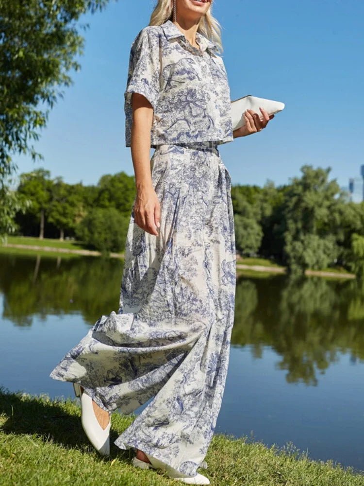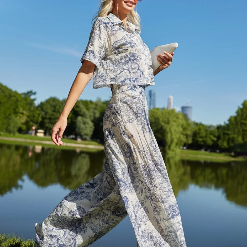 Conjunto Feminino Vintage 2025 – Camisa Polo Manga Curta + Calça Wide-Leg Estampada