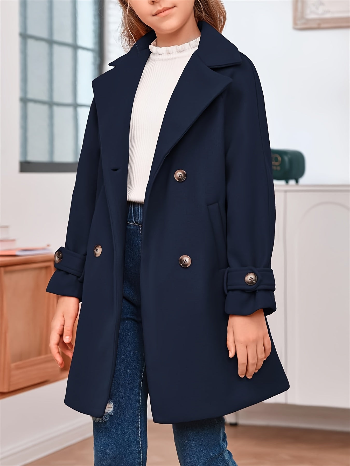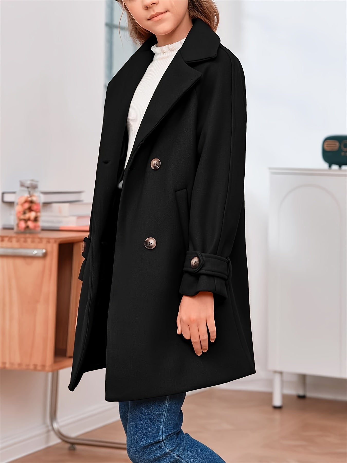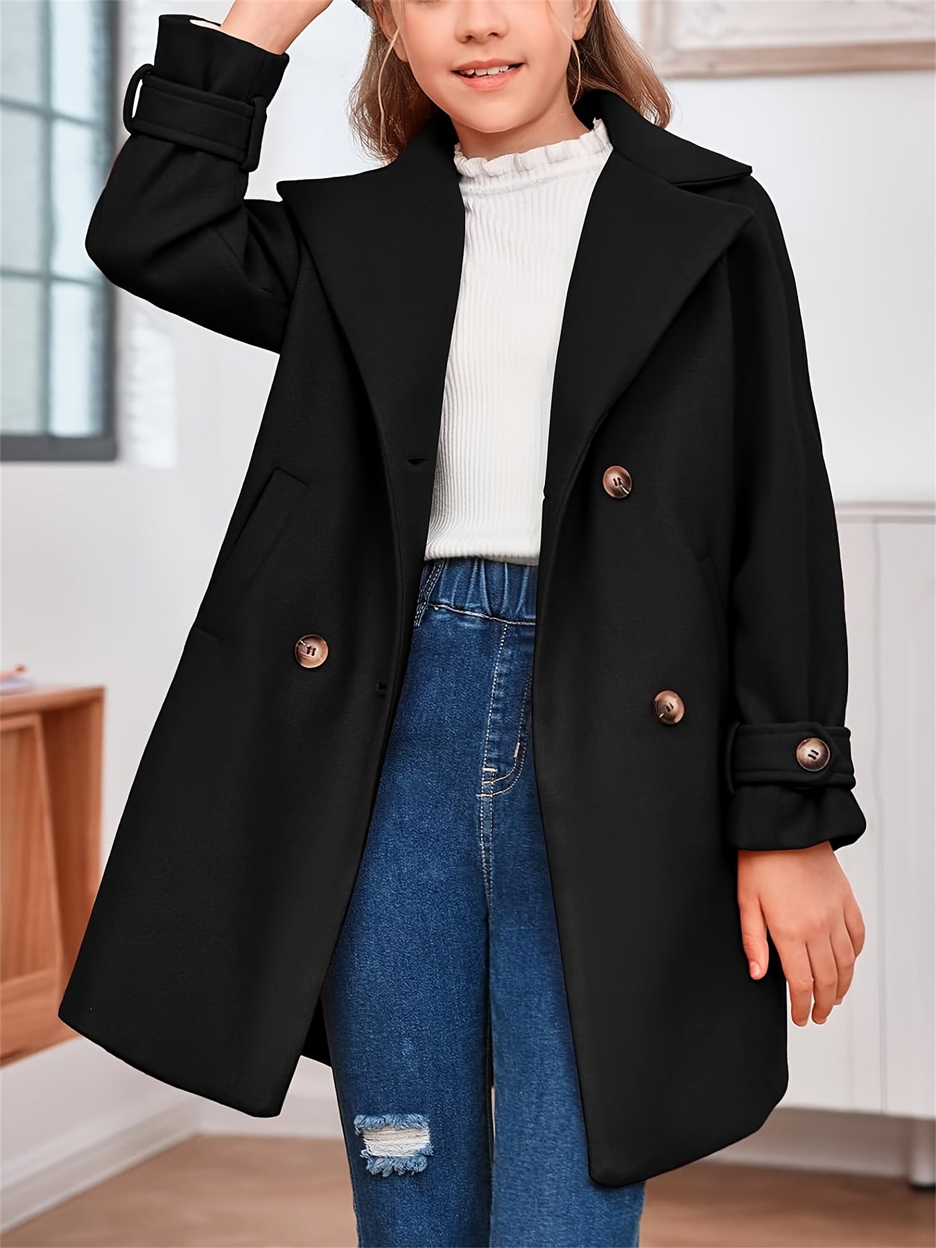 Apresentamos o Casaco Infantil Lã-Blend Duplo Botão – Estilo Clássico, uma peça cheia de charme e sofisticação para os momentos especiais ou para o cotidiano com elegância. O design inclui lapela discreta, fechamento duplo por botões e bolsos frontais funcionais — perfeito para combinar com vestidos, saias ou calças, tanto em outono quanto em inverno.
