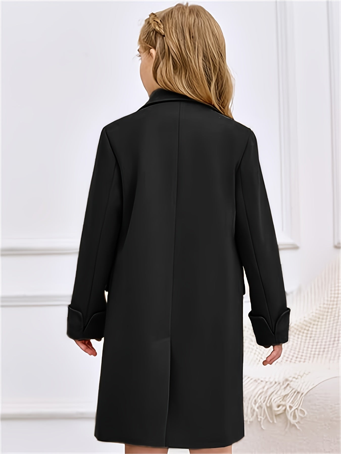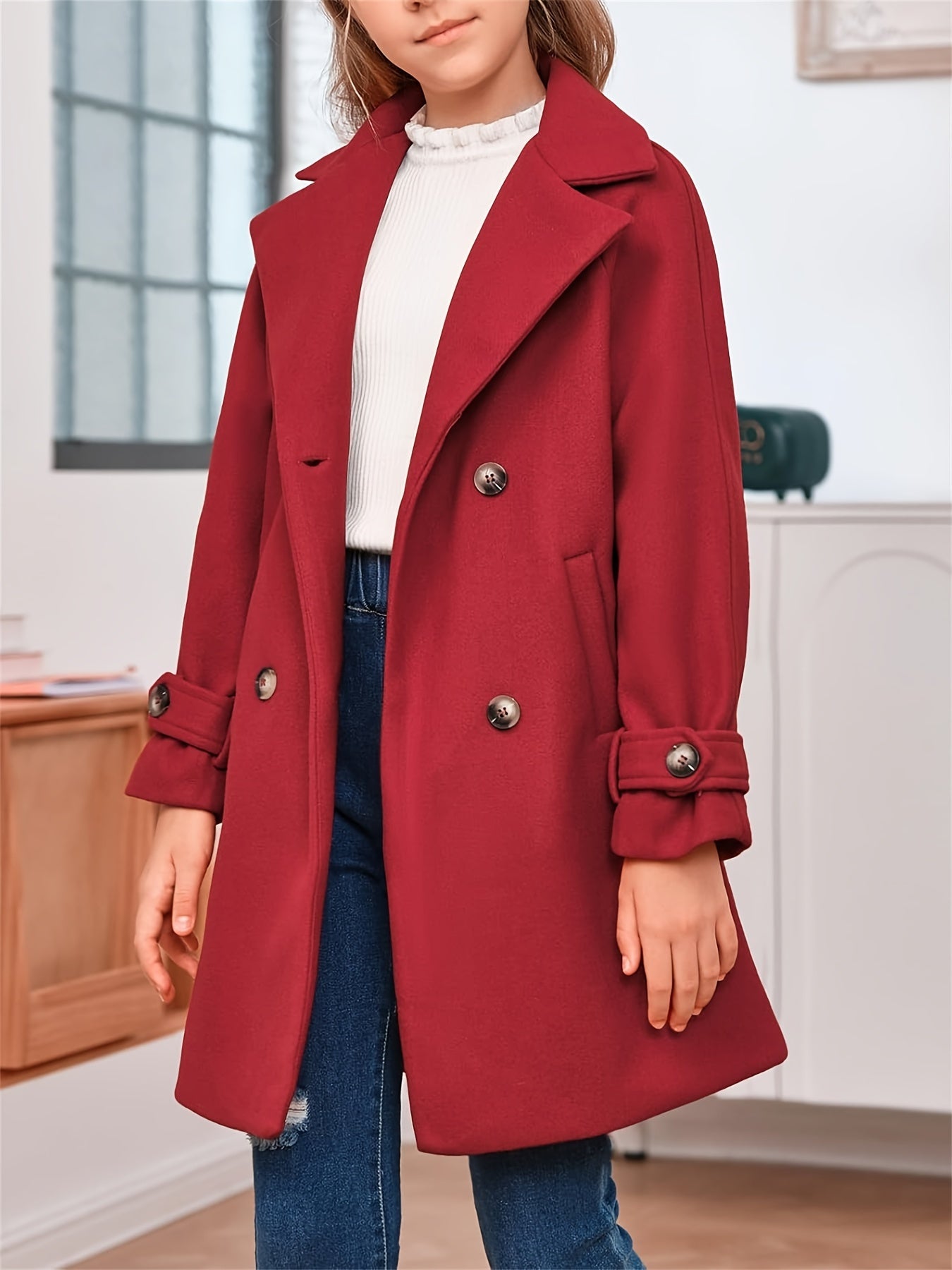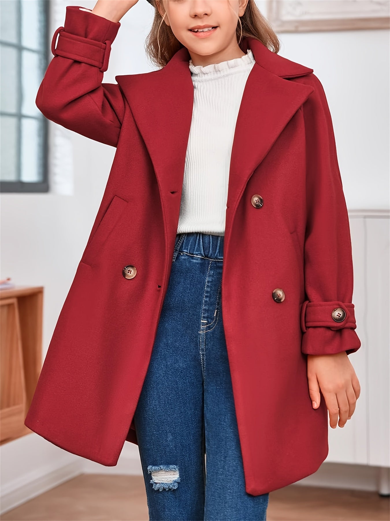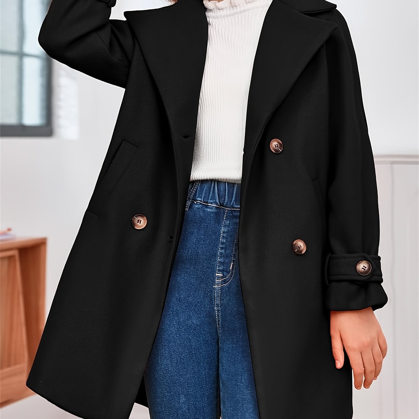 Apresentamos o Casaco Infantil Lã-Blend Duplo Botão – Estilo Clássico, uma peça cheia de charme e sofisticação para os momentos especiais ou para o cotidiano com elegância. O design inclui lapela discreta, fechamento duplo por botões e bolsos frontais funcionais — perfeito para combinar com vestidos, saias ou calças, tanto em outono quanto em inverno.