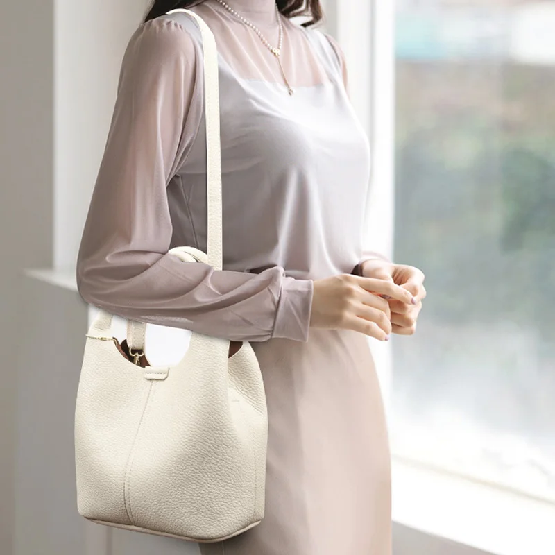 Refinada e flexível — esta bolsa bucket em couro macio (soft leather) foi pensada para mulheres que desejam unir elegância, conforto e funcionalidade.