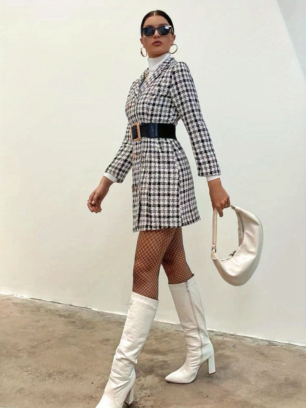 Casaco Feminino Xadrez Pied de Poule – Abotoamento Duplo, Manga Longa, Midi