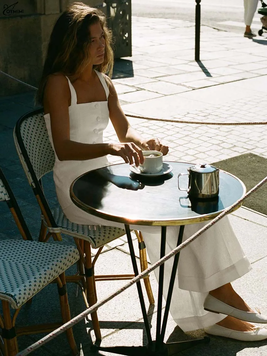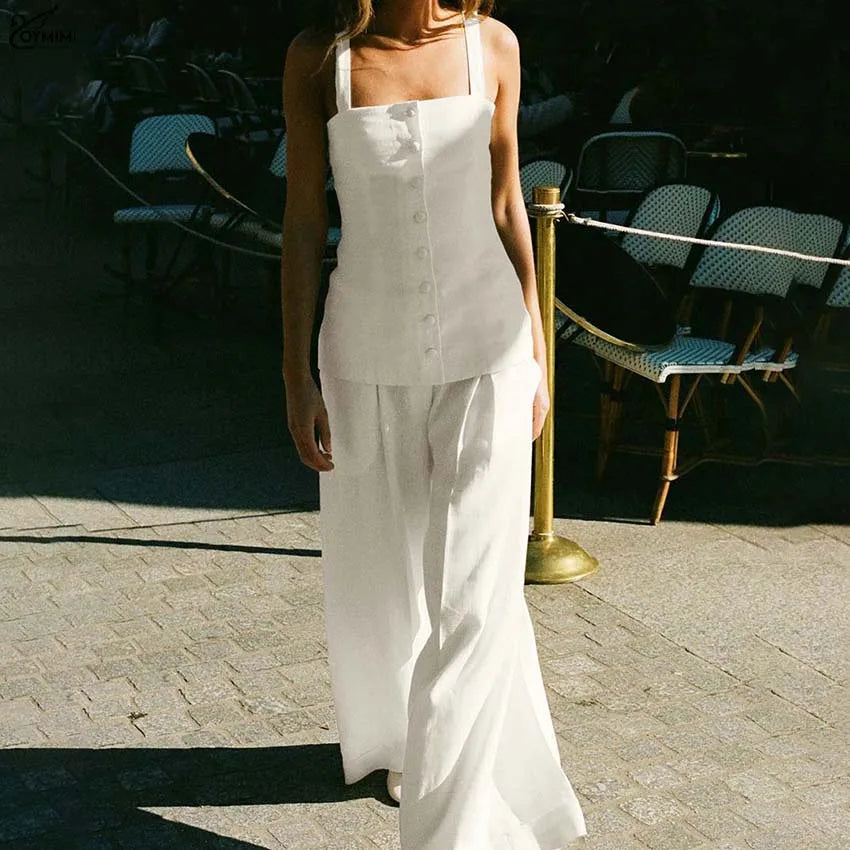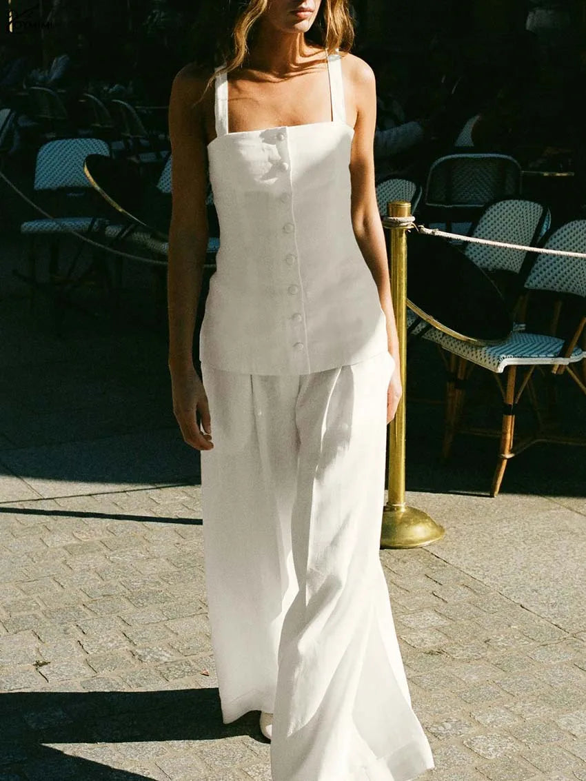 Modelagem & caimento: camisa com alças finas e corte reto, decote delicado e botões frontais que dão um toque discreto de elegância; calça com bolsos e corte clássico, combinando praticidade e estilo. A modelagem valoriza a silhueta mantendo conforto e mobilidade.