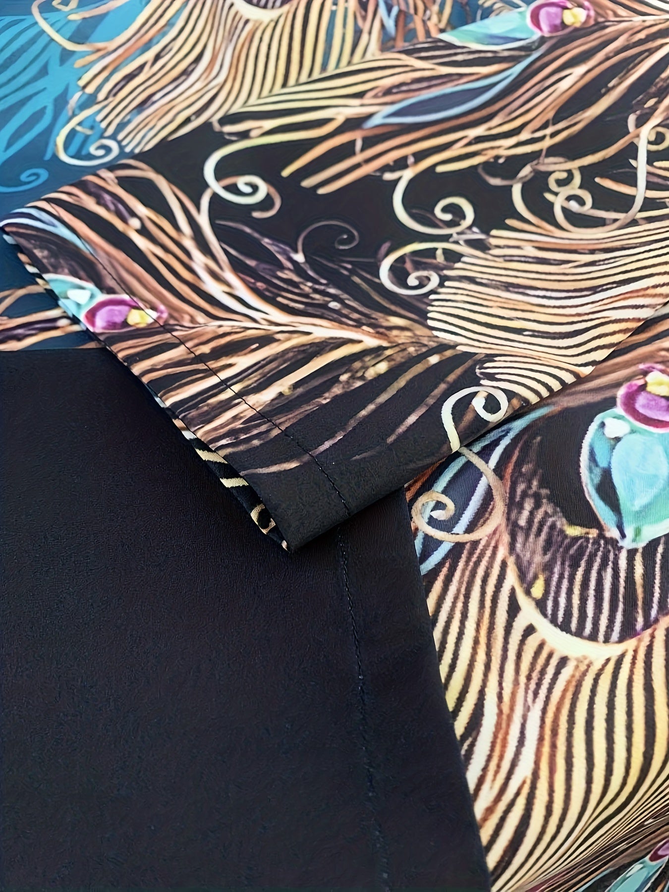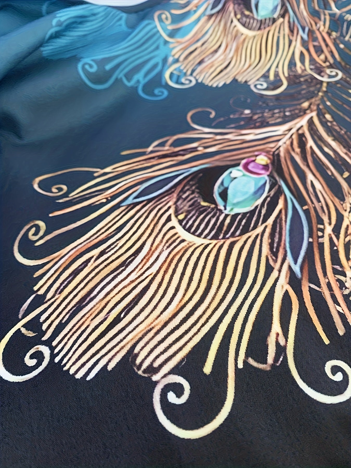 ✔ Estampa: padrão ombre com detalhes inspirados em plumas de pavão — textura visual que aporta movimento e sofisticação.