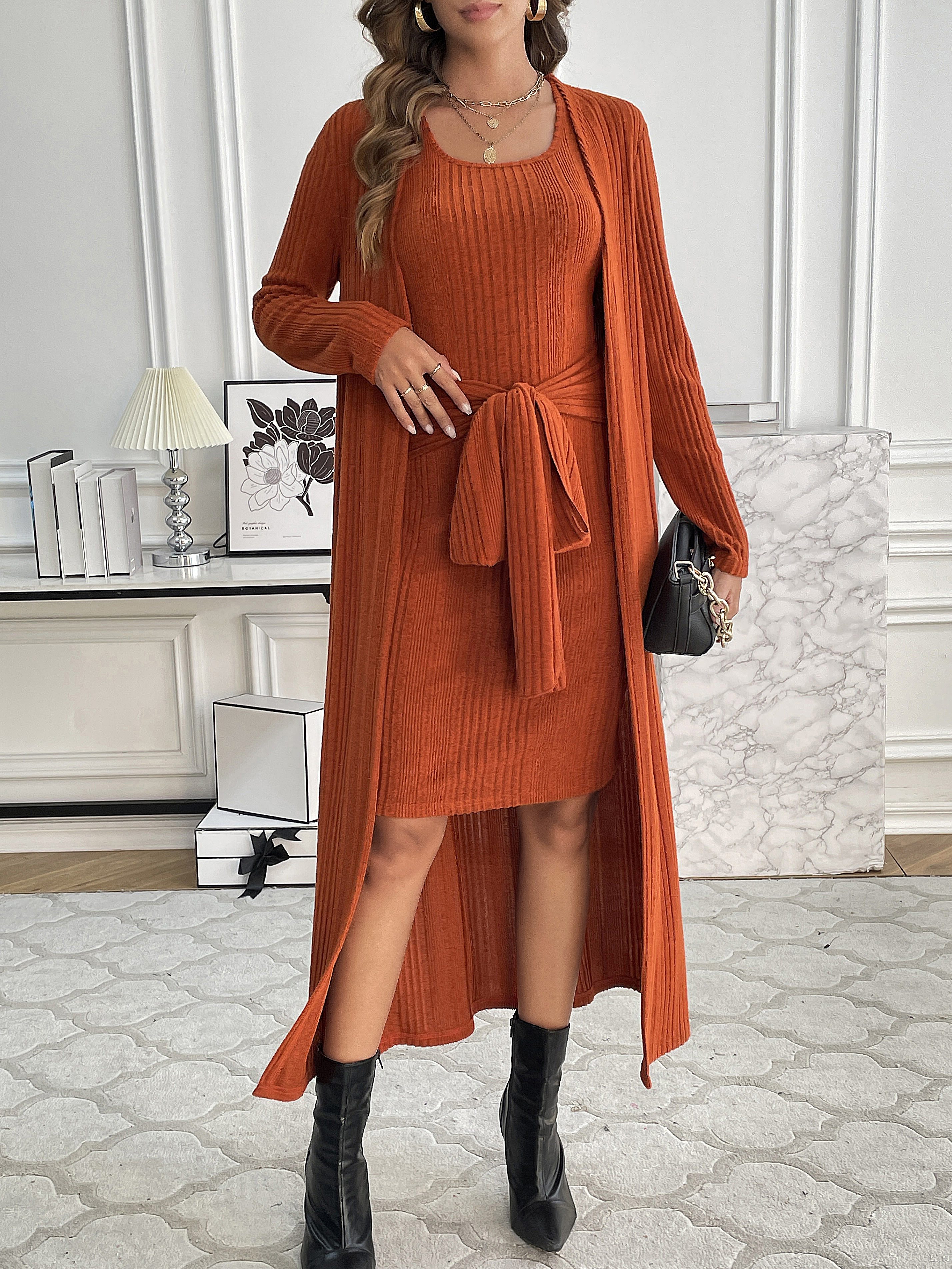 Conjunto Feminino Tricot Ribado – Cardigã Manga Longa + Vestido Alça Ajustável