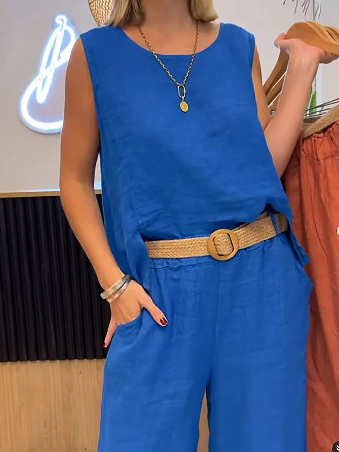 Apresentamos o Conjunto Cotton-Linen Chic – Top & Calça 2-Peças, confeccionado em tecido leve com visual de algodão-linho (“cotton linen”), composto por regata de gola-O sem mangas e calça de cintura média com elástico, ambos em corte reto e acabamento sólido — ideal para os dias de primavera e verão com estilo.