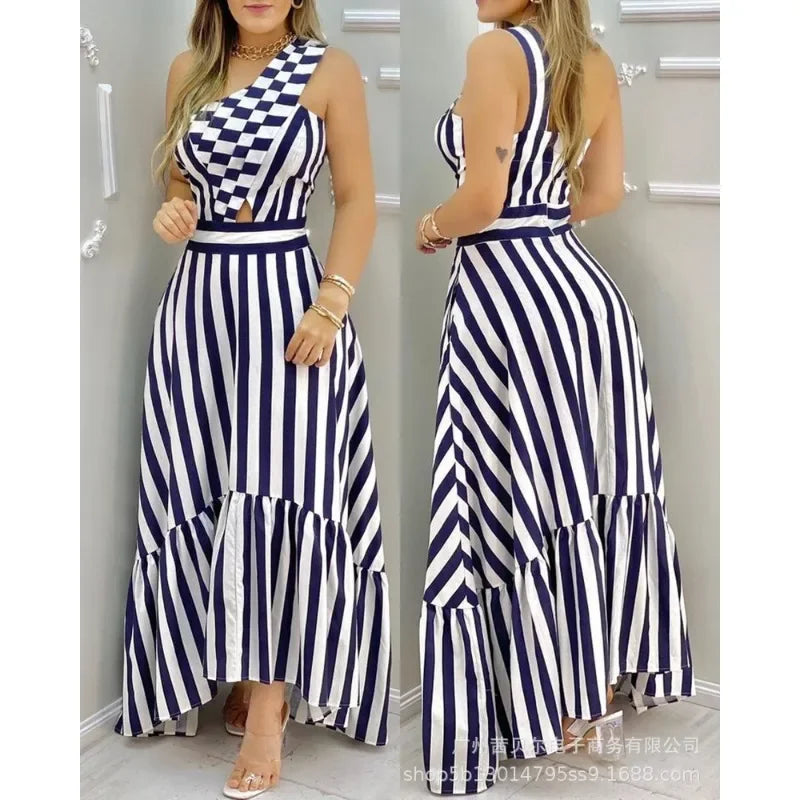 Vestido Listras & Recortes – Elegância Leve para Primavera e Verão