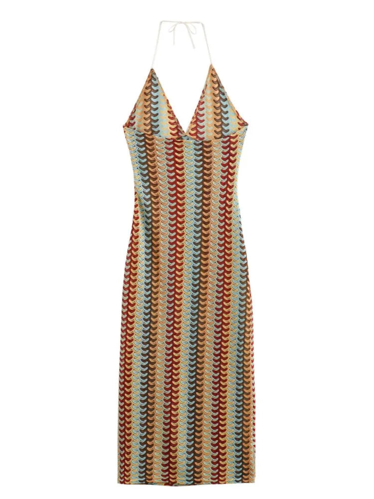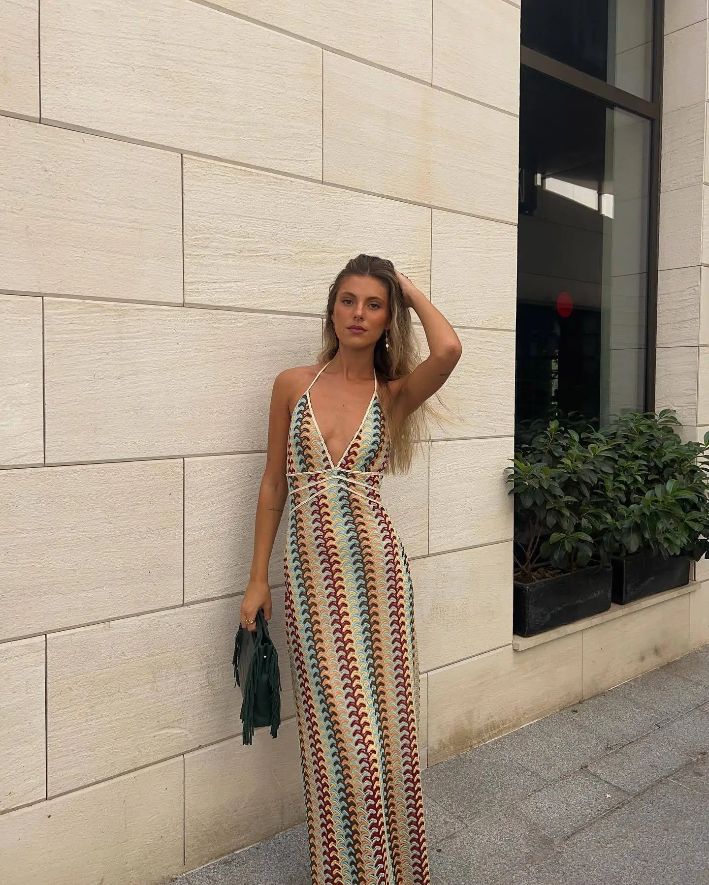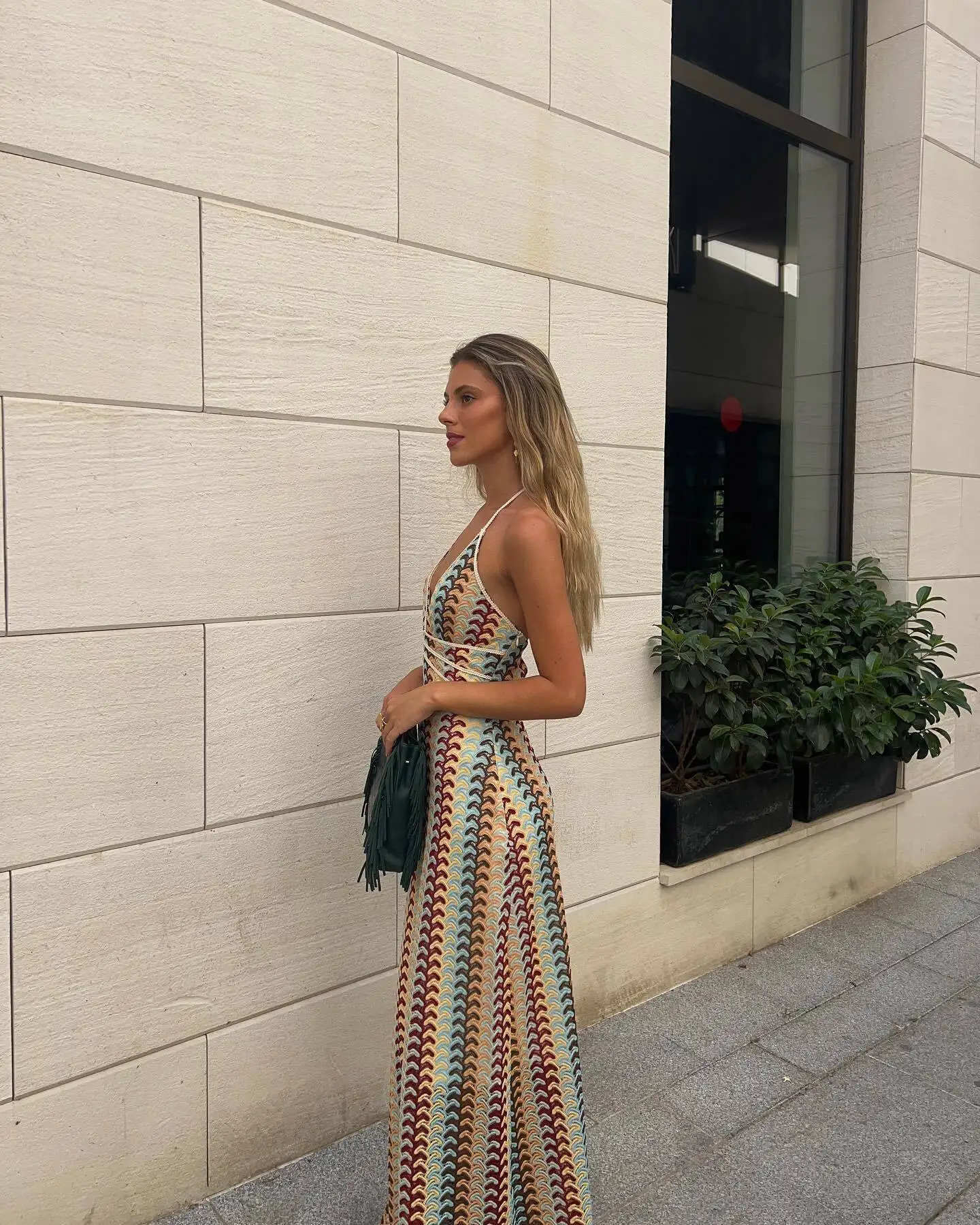 Modelagem & caimento: corte ajustado ao corpo, com decote em “V” profundo e alças halter que valorizam colo e ombros; o comprimento longo com recortes sutis cria uma silhueta elegante e alongada, perfeita para quem deseja um look sofisticado e impactante.