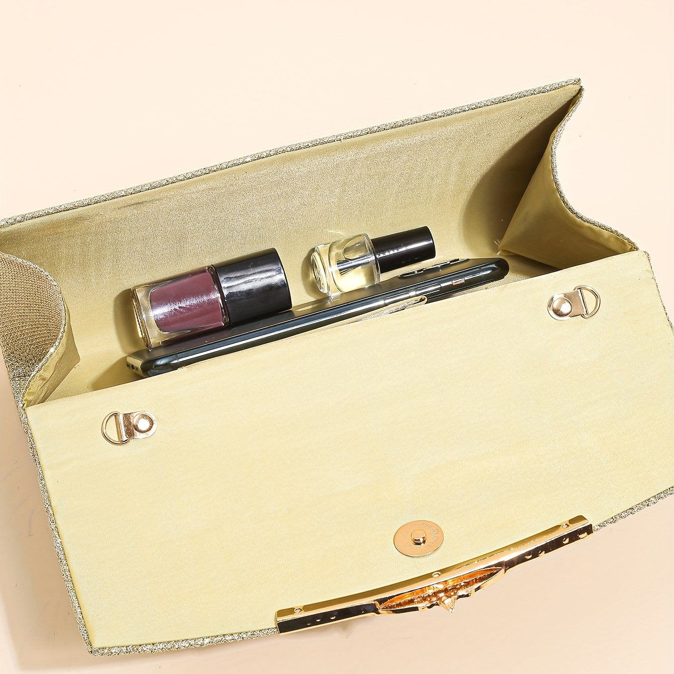 ✔ Material: poliéster com acabamento glitter, forro em nylon, fecho magnético (“magnet closure”) e armação metálica resistente para maior estrutura e impacto.